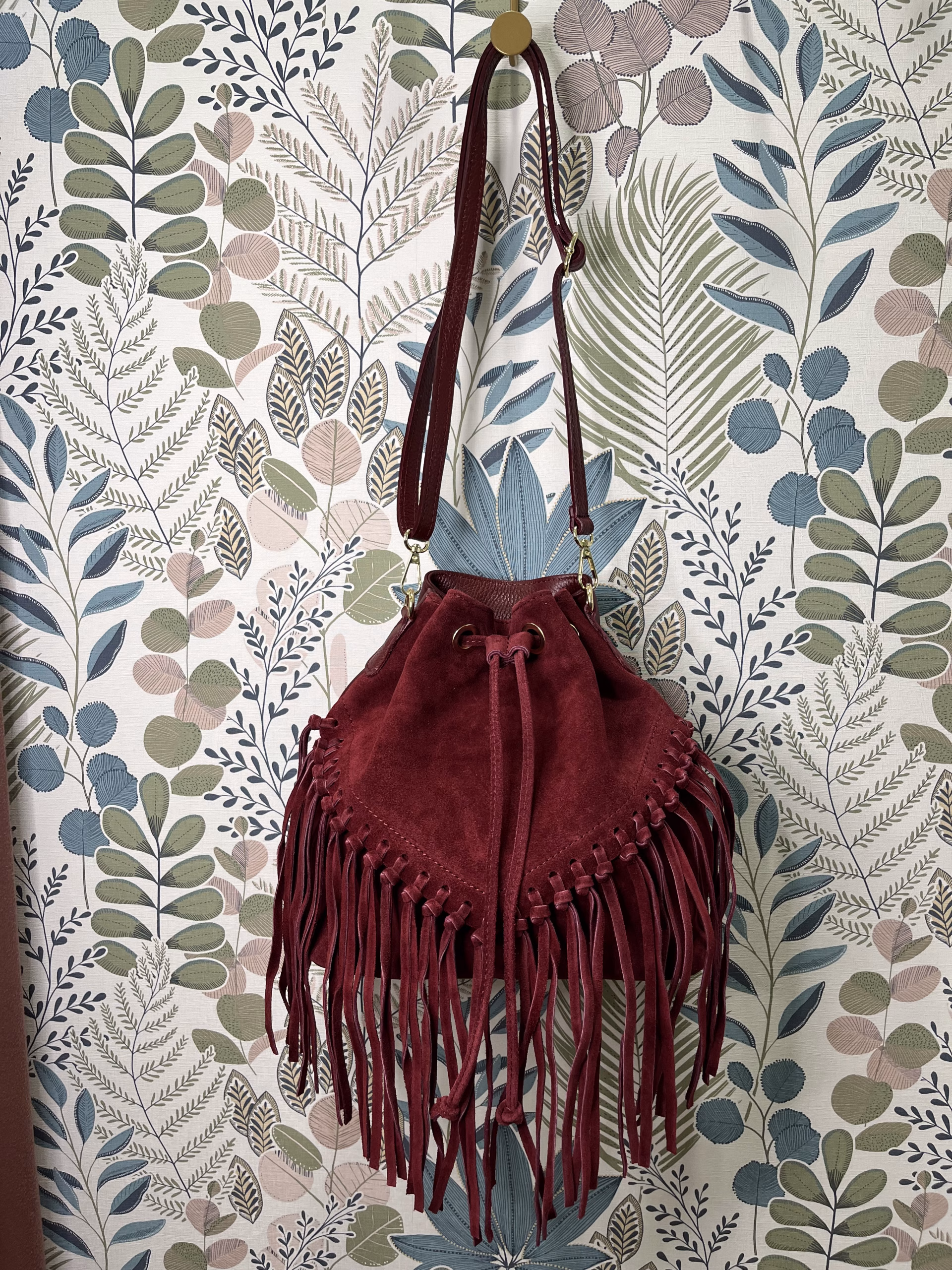 Borsa Secchiello con Frange in Vera Pelle Bordeaux